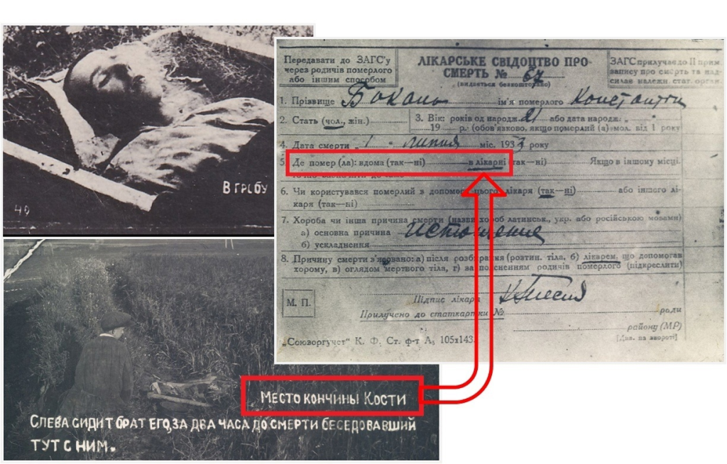 МЕСТО СМЕРТИ. На свидетельстве о смерти заявлено, что Константин умер в “лiкарне” в присутствии врача, а на фотографии Боканя место гибели – в поле, рядом с братом. Как так?