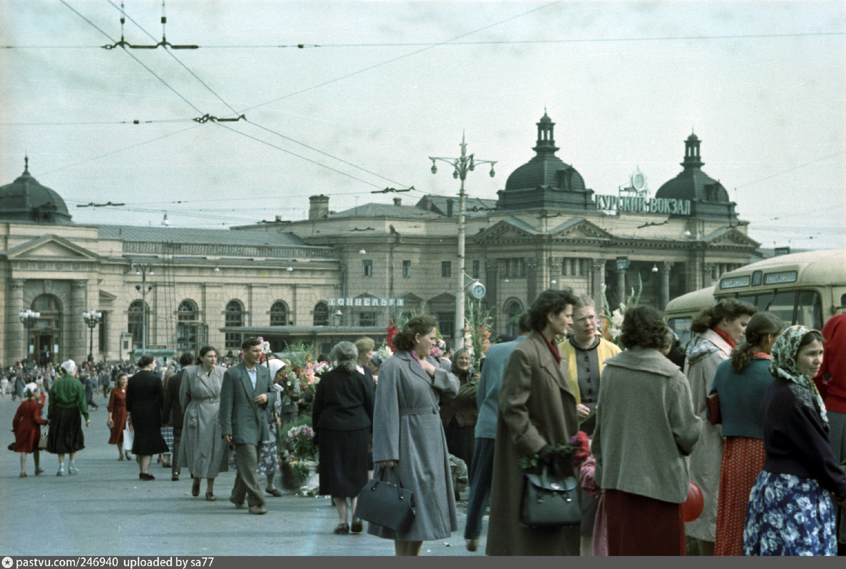 Мы с вами на площади у Курского вокзала, это вид со стороны входа на станцию метро "Курская". Здесь ещё видно во всей красе историческое здание вокзала. Фото 1962 года