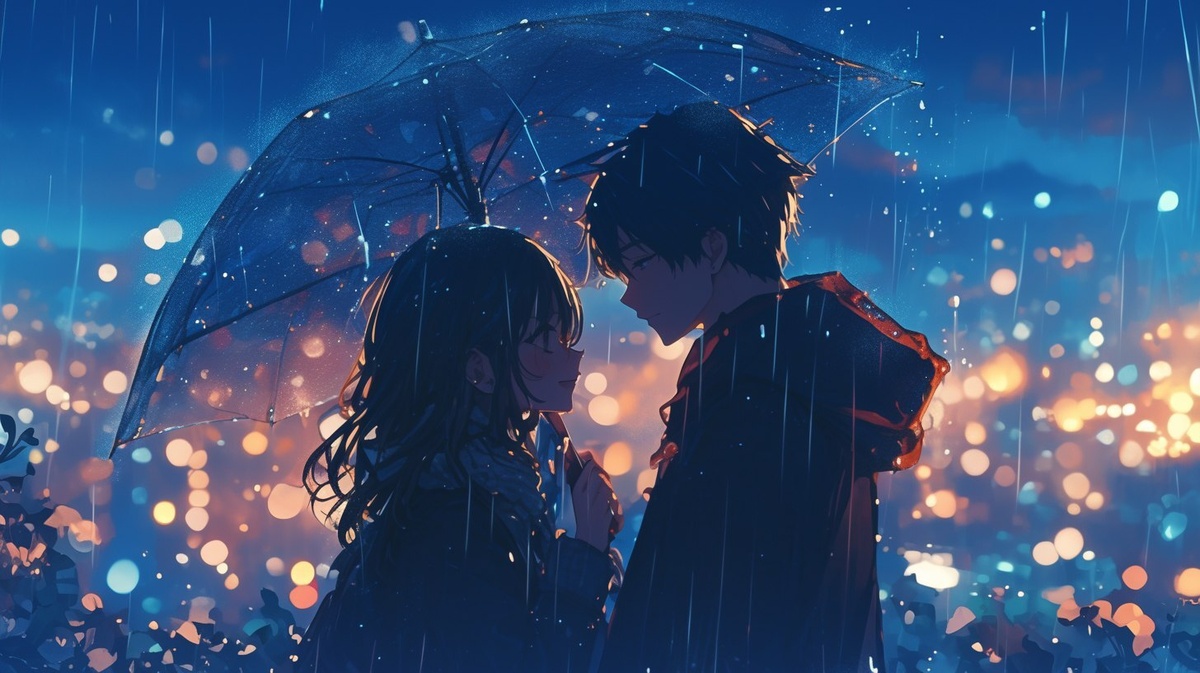 Создано на основе запроса: A heartwarming anime-style scene depicting a romantic couple standing together in the rain, sharing a single
