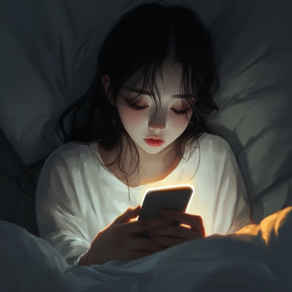 Создано на основе запроса: asian girl scrolling phone in bed, the light of her phone shines on her face - 16 :9 ar