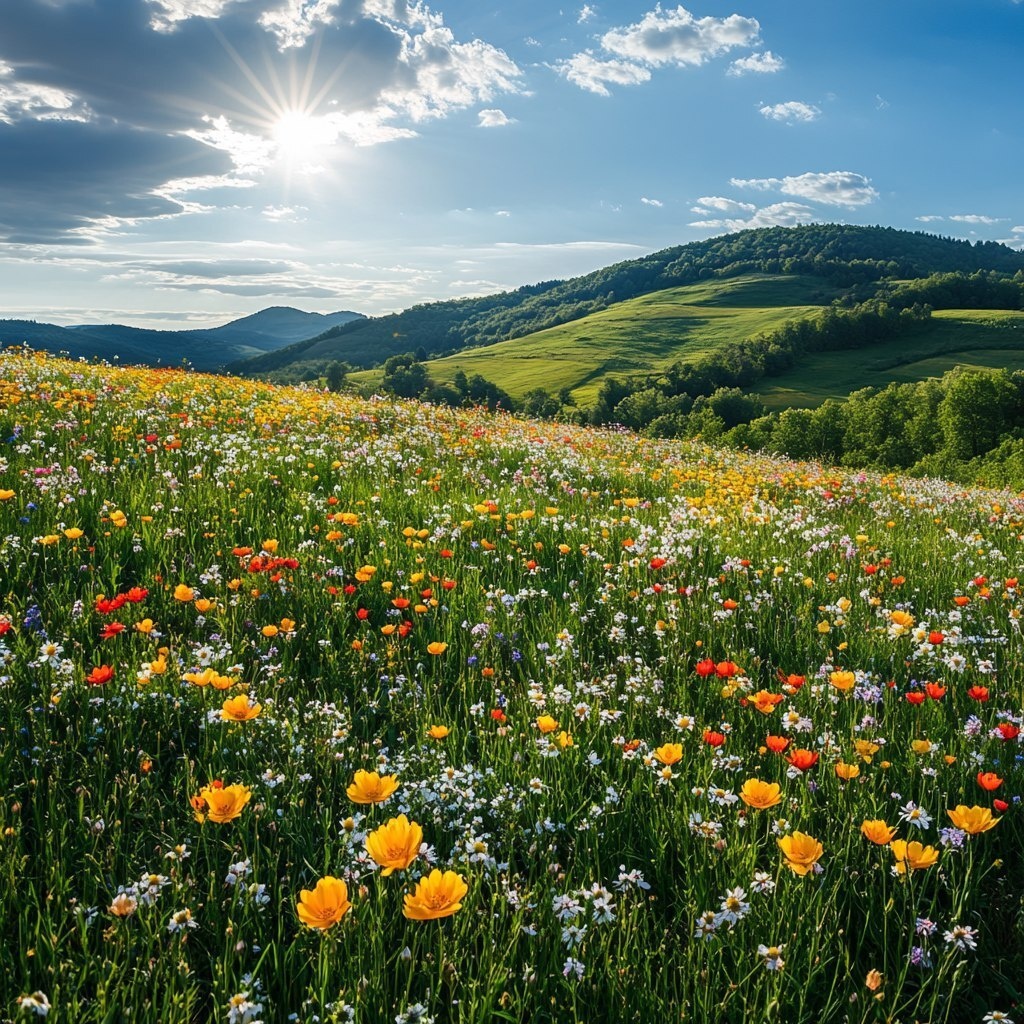 Создано на основе запроса: beautiful hill with flowers and sunshine