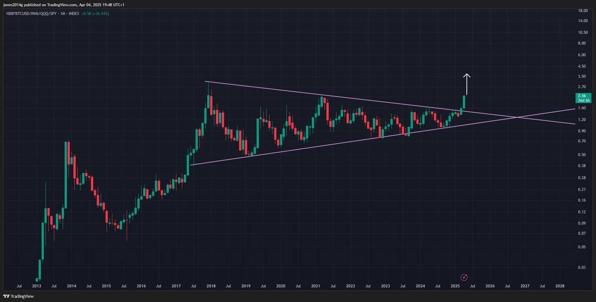 Прорыв 7-летнего клина. Биткоин начинает играть по своим правилам. Индикатор, о котором никто не говорит. На графике — соотношение BTC к IWM, QQQ и SPY. И если коротко: биткоин пробил 7-летний клин вверх. Это не просто локальный паттерн, это структура на месячном графике, которая формировалась с 2017 года. Что это значит? — Биткоин начинает опережать весь фондовый рынок сразу — Малые компании, техи, широкий индекс — всё проигрывает в относительной динамике — Это уже не просто раскорреляция, это смена фазы — Техническая цель по фигуре — x2 вверх от зоны пробоя Раньше биткоин ходил как “SPY на стероидах”. Сейчас он показывает: «Я — не техи. Я — сам по себе.» И если это движение подтвердится — мы можем увидеть историческое смещение капитала в пользу BTC на фоне стагнации или снижения традиционных активов. Я это называю — биткоин начинает играть по своим правилам. Сначала его боялись. Потом — смеялись. А теперь — начинают сравнивать с индексами. И он выигрывает. Вот такая перео