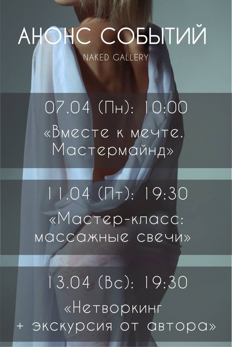 Неделя с 07.04 по 13.04 07.04 (Пн): 10:00 «Вместе к мечте» • мастер-майнд Группа на месяц с Аллой Топорской (создательница NAKED GALLERY.) Помогаем друг другу расти - 5000р , 4 встречи в апреле. ➡️ возможно присоединиться, подать заявку - @toporskaya ⬅️ 11.04 (Пт): 19:30 «Мастер-класс по изготовлению массажных свечей» + экскурсия по галерее •Warm Whale - 2000₽/чел, вдвоем - 1800₽/чел ➡️Записаться на мероприятие⬅️ 13.04 (Вс): 19:30 «Нетворкинг + экскурсия от автора» •Автор действующей выставки и владелица Naked Gallery Алла Топорская - 800₽/чел ➡️Запись на мероприятие - @toporskaya ⬅️ Ждём вас в NAKED GALLERY 📍Ярославль, Трефолева, 15а (Домик с горгульями) ❗Запись ведется только через экспертов мероприятия, не переводите деньги другим людям ❗