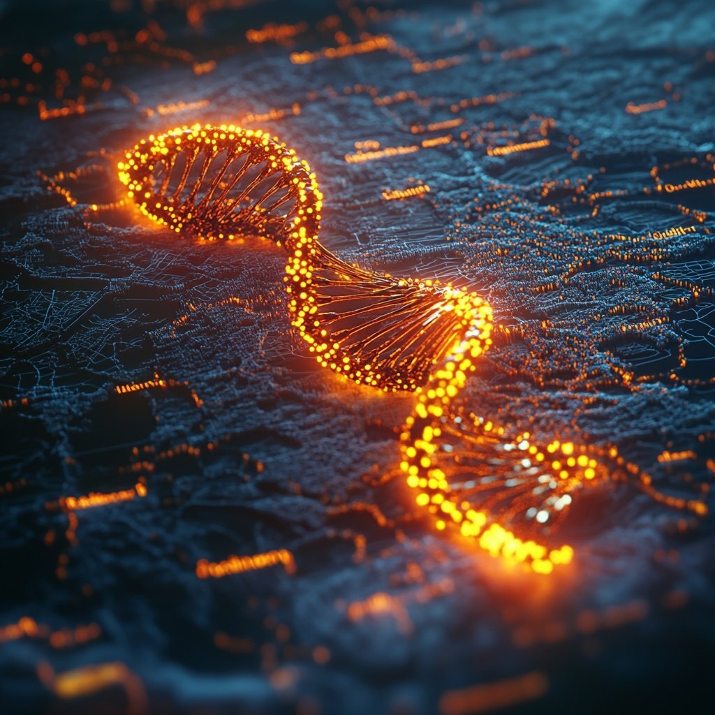 Создано на основе запроса: a glowing DNA double helix overlaid on a translucent map of Central Asia, futuristic lighting, scientific and dramatic composition, cinematic style, ultra-detailed, soft shadows, high contrast, 16:9