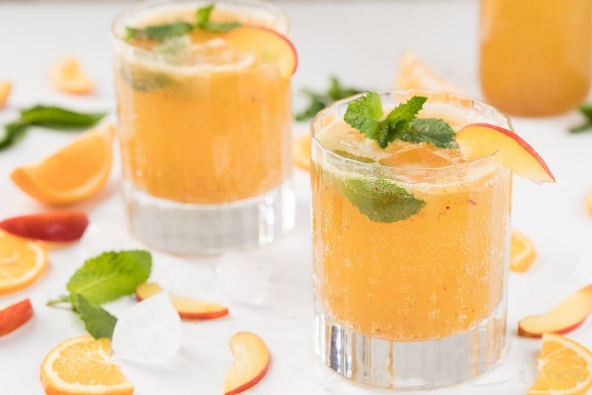 📖 Ингредиенты: - Персик - 5 шт. - Лимон - 2 шт. - Мята - 3-4 веточки - Сахар - 4 ст. л. - Вода - 150 мл. - Газированная вода - 1 л. 🧑🏻🍳 Приготовление: 1. Тщательно вымыть лимоны и снять с них цедру на мелкой терке. Добавить к цедре листочки мяты, воду. Отправить смесь на огонь и довести ее до кипения. 2. Снять с огня и дать настояться 5-7 минут. Затем процедить сироп через сито. 3. Выжать сок из лимонов и смешать его с сиропом. 4.Тщательно пробить персики блендером до состояния пюре. 5. Протереть массу через сито, чтобы избавиться от пюре. 6. Соединить персиковое пюре с приготовленным сиропом. Залить газированной водой. Дать настояться 15 минут.