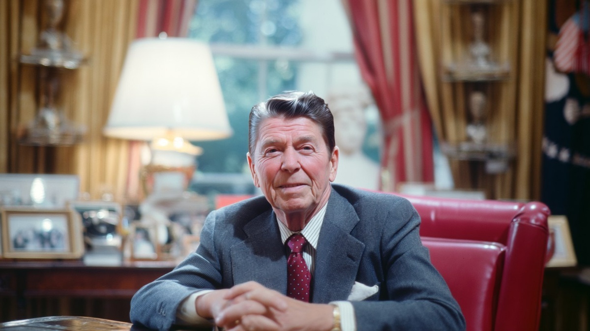 Создано на основе запроса: Ronald Reagan sitting at the Resolute Desk in the Oval Office looking at the camera firmly