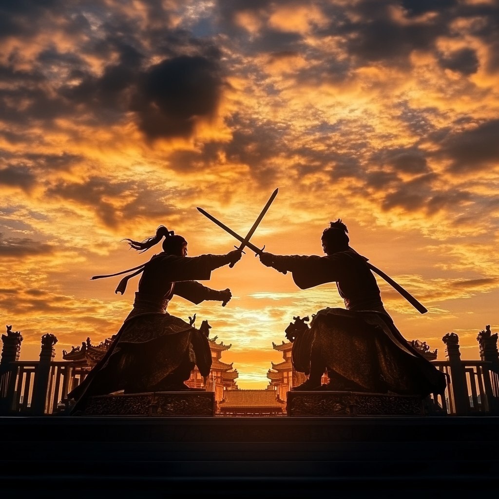 Создано на основе запроса: two Mongol warrior brothers silhouetted in a sword fight over a royal throne, dramatic sunset background, high