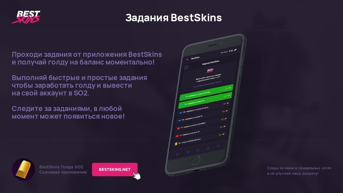 Задания BestSkins Голда 🥰 Проходи легкие задания от BestSkins и получай голду моментально! 🦁 Зарабатывай голду прямо сейчас и выводи её на игровой аккаунт в SO2! 🤩 💎 Скачать - https://bestskins.net