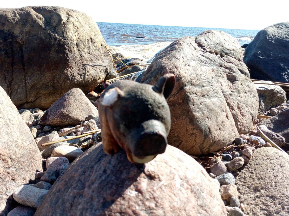 Свинья на берегу На ладожские валуны недавним штормом выбросило свинью с потрепанным ухом. Чего только не встретишь в путешествиях. В лесу саркосцифа проросла, хоть грибную корзинку бери. Воды мало, тревожный знак. Но цветет пушица влагалищная. Ветер холоднючий, солнце припекает. Ожика из под земли ползет, вода синяя-синяя и снега почти нет. Так, пятна редкие и закрайки луж с утра не оттаяли. Нужно быть полным дураком, чтобы в такой весенний солнечный день в городе сидеть.