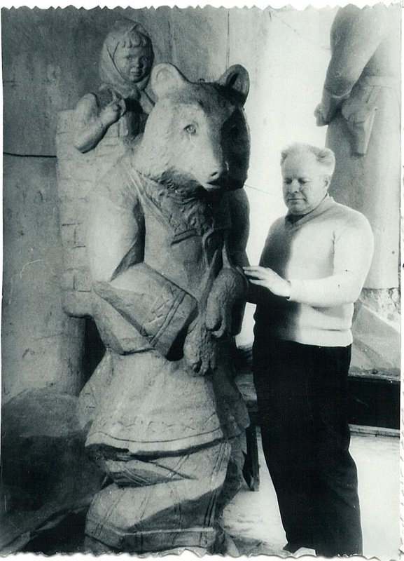 Фото. Л. Захаров у скульптуры «Маша и медведь» (Для детского парка, г. Курган) 1966 г. Источник: "Курганский областной краеведческий музей" https://vk.cc/cKxPSQ