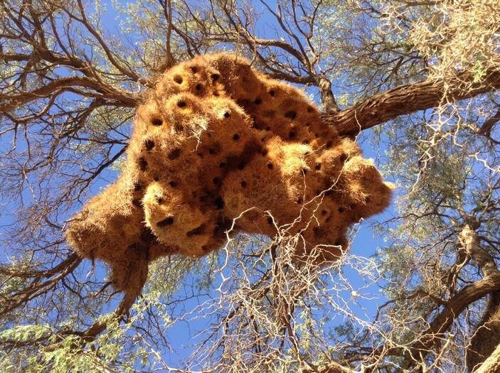 Речь о так называемых общественных ткачиках, которые распространены на юге Африки. Свои «коммуналки» эти птицы строят чаще всего на деревьях, но иногда даже на столбах линии электропередач.