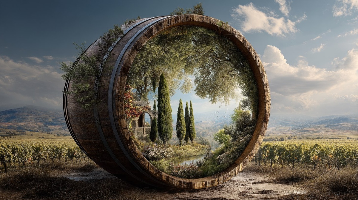 Создано на основе запроса: surreal and symbolic depiction of a Tuscany Italy summarized inside an empty wine cask standing in a vineyard