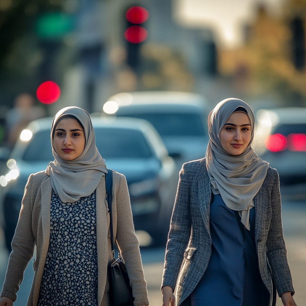 Создано на основе запроса: two women crossing road. One wearing hijab with professional attire. Another woman wearing hijab with casual attireq. In the background, bokeh image of cars i the traffic light. Picture taken using 200mm f2 lens with Severance color style. --- Автоперевод: Две женщины пересекают дорогу. Отлично выглядит? 🤔 https://dzen.ru/id/65c0c65c86e4f837c27b24d7 #ИИ #AI #нейросеть #midjourney #art
