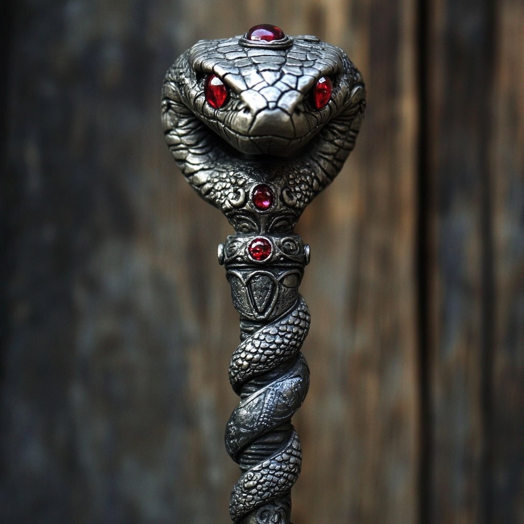 Создано на основе запроса: realistic beautifully fantasy mystical otherworldly mechanical long staff with a snakes head and Ruby eyes