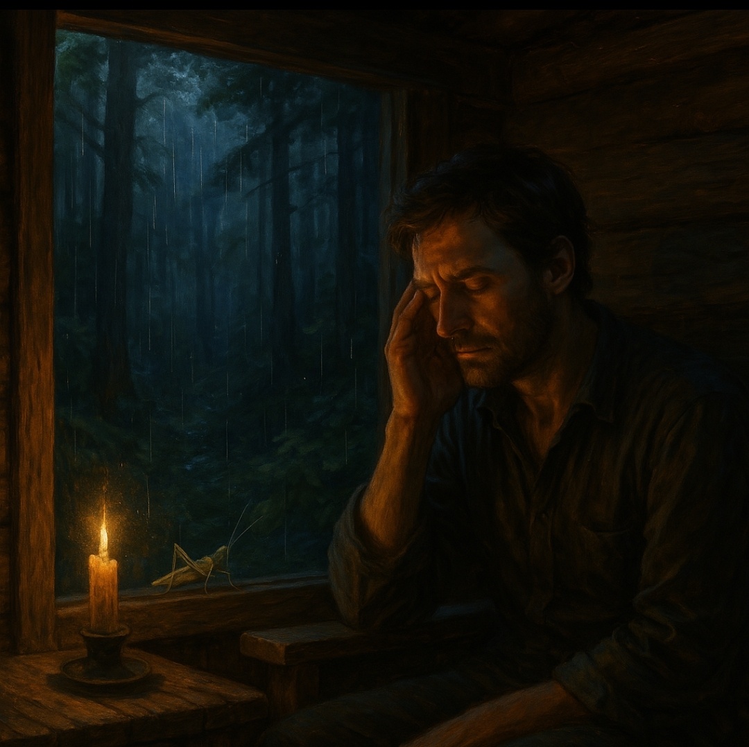 И вот человек сидит в лесной избушке, а шум ума всё такой же — только вместо городского гудка за окном теперь — стрекочущий кузнечик.
