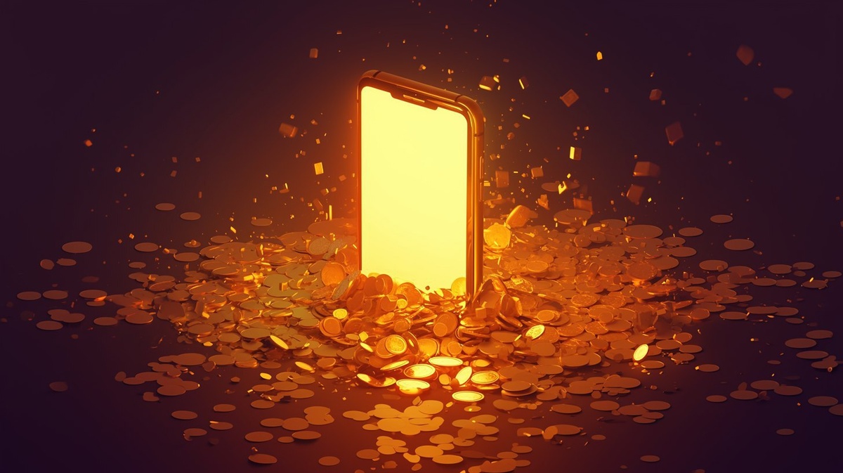 Создано на основе запроса: 3d game style, black phone vertically stand among the coins, shining