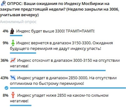 На прошлой неделе было 4 опроса! Проверим, кто был Вангой: 1️⃣ Опрос про ожидания по Индексу Мосбиржи! Неделю закрыли на уровне 2752, сделав за неделю -187 пунктов! Большинство (43%) ждали индекс в диапазон 2850-3000, я в их числе, ожидая, что кольнут ниже рынок на отсутствии быстрого перемирия, и на маржин-колах, но на маржин-колах цена пролетела существенно ниже! Только 8% ждали индекс ниже 2850! Это и есть Ванги! 36% уже ждали, что рынок пойдет вверх без негатива, а 6% считали, что Трамп всё еще Памп. 2️⃣ Опрос по паре юань-рубль! Юань-рубль закрылся на уровне 11,7195, а это значит, что 40% - Ванги! Это был самый популярный ответ! На втором месте 30% голосовавших ожидали, что валютная пара сделает рывок выше 12,12. 3️⃣ Опрос по инфляции! Инфляция была +0,20%, то есть она все еще высокая. Бенефициарами роста снова стал картофель +4,0%. Индекс вырос в тот вечер почти на 1,6%! Всего 12% оказались Вангами - это был самый не популярный ответ! Большинство ждало инфляцию выше и падение