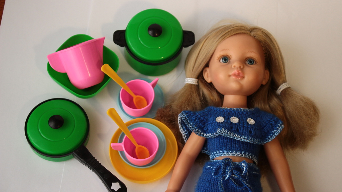 для моего хобби..... Идеи для мам и бабушек, как интересно и с пользой провести совместное время с детьми. Знаю, что современные дети почти не играют в куклы, гаджеты для них самые лучшие игрушки. Но всё в наших руках! Я сразу захотела немного изменить внешний вид кружечек и ложечек, придать им, так сказать, вид более реалистичный. Кастрюлька и сковородка сочного изумрудного цвета, очень мне нравятся. Это сколько же я могу придумать всяких интересных композиций! Вот! Посмотрите, как посудка подходит по размеру куколкам. Сегодня в магазинах уже нет той кукольной посудки, которая была у нас в нашем далёком детстве. Честно, я не сохранила упаковки и не знаю, где произведены эти игрушки. Может быть в Китае, может быть в России.... Мы можем не только вязат