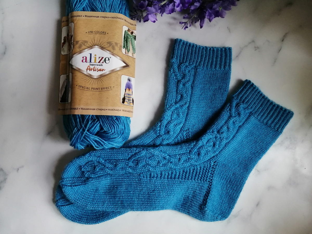 Добрый день, друзья! Предлагаю связать со мной новую модель женских носочков спицами на размер 37-38. Узор очень симпатичный, совсем не сложный, но требует немножко внимания. Вязала из носочной пряжи Пряжа: Alize Superwash Artisan Состав: 75% шерсть, 25% полиамид Метраж: 420 м на 100 г Цвет: 957 Вязала на спицах 2,5 мм на 68 петлях. Вес готового изделия - 66 г. На спицы 2.5 мм набрать 68 петель усиленным эластичным набором и связать 15 рядов (3 см) резинкой 1х1 со скрещенной лицевой петлей. Далее по передней части носочка перейти на узор и связать паголенок необходимой длины. У меня он составил 1 полный раппорт (9 см). Далее вяжем пяточку - подкову на 34 петлях, соблюдая симметрию узора. Заднюю стенку пятки вяжем на высоту 34 ряда лицевой гладью. При этом после кромочной и перед кромочной 1 петлю я вязала платочной вязкой (так удобнее считать ряды) Далее начинаем вязать скос. 1 ряд: провязать 17 петель лицевыми. Далее 1 лицевая, 2 вместе лицевой с наклоном влево, 1 лицевая. Вязание пов