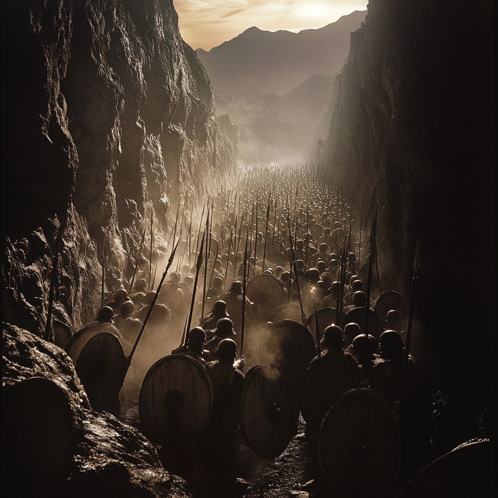 Создано на основе запроса: a night shot of an ancient Greek battlefield. In a narrow mountain pass, King Leonidas leads 300 elite Spartan warriors as they face the massive Persian army. The soldiers form a phalanx formation, locking their shields together to create an impenetrable wall, with spears protruding through the gaps to strike at the advancing enemies. Under the scorching sun, dust rises into the air, and the Spartans’ expressions are filled with determination and ferocity. Behind them, steep cliffs and caves stretch into the distance, while waves of Persian soldiers surge forward from the front. Shields and spears gleam in the light, and the entire scene radiates tension and raw power
