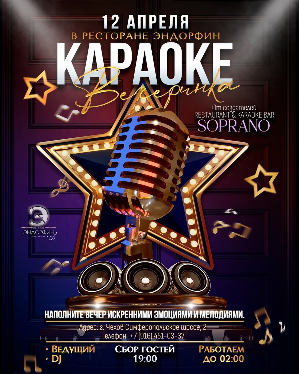 ✨ Караоке от Сопрано в ресторане Эндорфин! 🎤 Дорогие друзья! С радостью сообщаем, что ресторан-караоке-бар Сопрано проводит незабываемую караоке вечеринку в ресторане Эндорфин! 🎉 Приглашаем всех желающих погрузиться в атмосферу музыки и веселья! 🎶 Поддержите своих друзей и покажите свои вокальные таланты в дружеской обстановке! Не упустите шанс стать звездой вечера! 🌟 Ждем вас с нетерпением! 💖 🚫 Возраст: 18+ 📆 12.04.2025 🕛 19:00 🏢 Ресторан ЭНДОРФИН 📍 г. Чехов, Симферопольское ш., 2 #webЧехов ✅ Мероприятия Чехов https://dzen.ru/id/66cc4b48e9ef144699238a51 http://vk.com/chekhov_events http://dzen.ru/chekhov_events