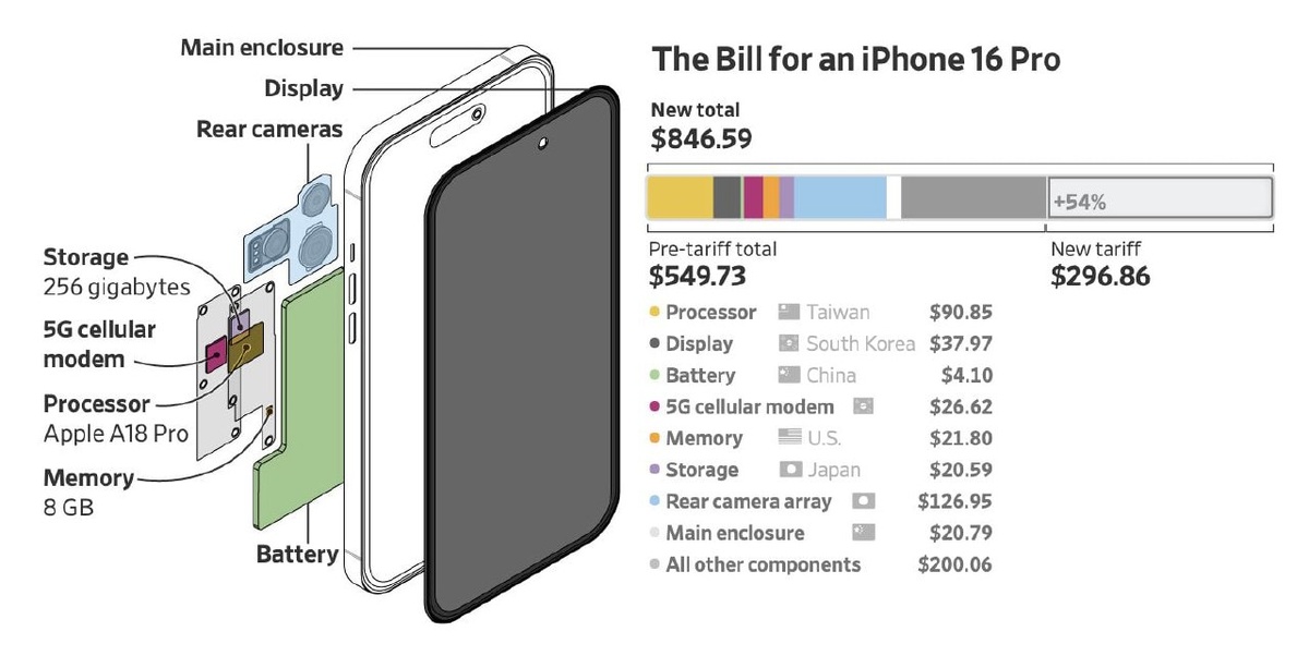 Однако это умение Apple поддерживать стабильность цен сейчас будет проверено на прочность. Издание The Wall Street Journal разобрало себестоимость смартфона iPhone 16 Pro и подсчитало возможный рост цен в США из-за новых тарифов. И цифры, надо сказать, впечатляют не меньше, чем умение Apple делать деньги из воздуха. По данным аналитика компании TechInsights Уэйна Лэма, себестоимость комплектующих для версии iPhone 16 Pro с накопителем на 256GB составляет около 550 долларов. С учетом сборки и тестирования затраты Apple достигают 580 долларов за устройство. При розничной цене в 1100 долларов прибыль выглядит весьма неплохой, даже если вычесть расходы на рекламу и поддержку сервисов вроде iMessage и iCloud. Однако грядущее повышение импортных пошлин на товары из Китая до 54% может серьезно ударить по марже компании. По подсчетам экспертов, только производственные затраты вырастут до 850 долларов. И что-то подсказывает, что компания, достигшая капитализации в несколько триллионов долларо
