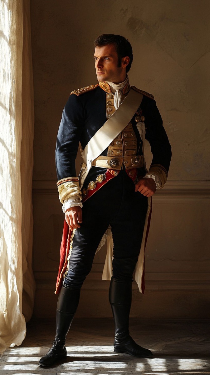 Создано на основе запроса: Napoleon Bonaparte standing proudly in a grand military uniform, full body view, realistic and heroic posture