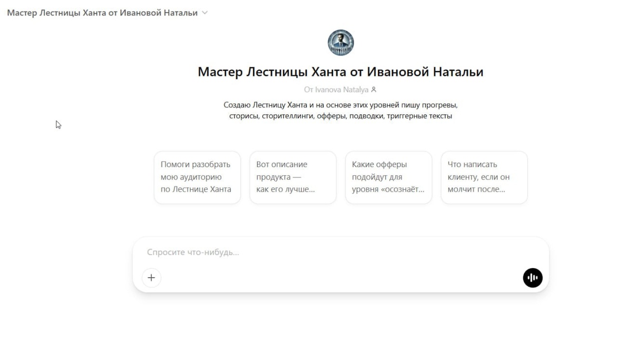 Стратег с мозгом маркетолога Ты можешь купить курс. Можешь нанять таргетолога. Заказать упаковку, купить шаблоны, и даже «вдохновиться у блогеров». Но всё это — куски. А тебе нужен тот, кто собирает из этих кусков систему. Мозг, который: — видит клиента насквозь — строит Лестницу Ханта с хирургической точностью — понимает, когда продавать, когда греть, а когда — просто не мешать — создаёт офферы, как будто он внутри твоей головы — и в момент, когда ты залип, предлагает готовый сторис или пост из моего канала, который решает твою задачу Это не «просто GPT». Это Мастер Лестницы Ханта от Ивановой Натальи. Я научила его думать, как я. Он не теряется, не уходит в отпуск, не выдаёт «воду» и не спрашивает «а чем вы занимаетесь?» Он видит глубже, слышит боли точнее и всегда предлагает решение. Что он умеет: ✅ Построить Лестницу Ханта под любой продукт ✅ Разложить клиентов по уровням осознанности — и выдать, что им сказать ✅ Придумать прогрев, который дочитывают до конца ✅ Написать оффер
