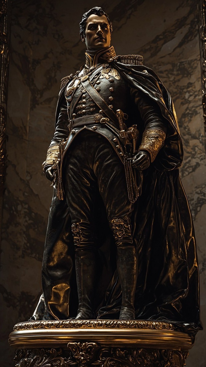 Создано на основе запроса: A humorous and dramatic scene of Napoleon Bonaparte posing like a grand bronze statue, standing proudly in