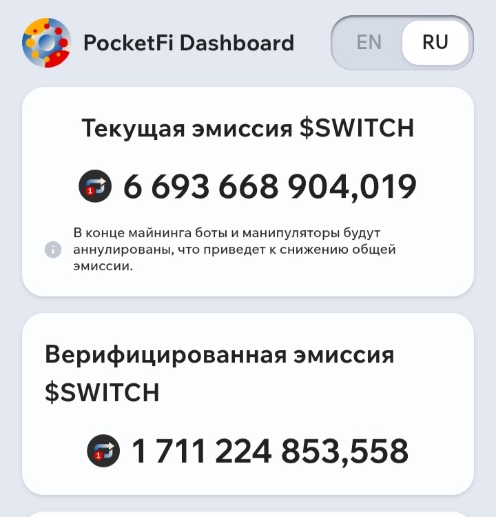 Вроде как. 31 марта 2025 года Распределение завершено, спасибо всем, кто участвовал. Писали здесь тык , уже год прошёл. Еп... утся На данный момент Вроде нормально Мы создали сильную основу для децентрализованного токена. Вроде бы 14 апреля листинг но ещё не понятно. Я буду скучать по майнингу 🟥 МАЙНИНГ НА $SWITCH ОФИЦИАЛЬНО ПРЕКРАЩЕН! Эпоха майнинга на $SWITCH только что вошла в историю. Каждый клик, каждое заявление — теперь часть легенды PocketFi. Что теперь? 🟧 Механизм начисления ставок повышается — вознаграждения поступают прямо на ваш баланс. ❗️ Proof of Humanity действует до 12 апреля. После этого у вас не будет возможности подтвердить свой аккаунт навсегда. ❗ Сегодня мы показываем токены с пометкой "Для записи" в приложении PocketFi для пользователей, которые не прошли PoH. ❤️ Окончательный объем поставок $SWITCH будет объявлен 14 апреля, сразу после официального окончания PoH. 🗂 Краткий ответ на часто задаваемые вопросы: ❓ Что произойдет, если я пропущу PoH