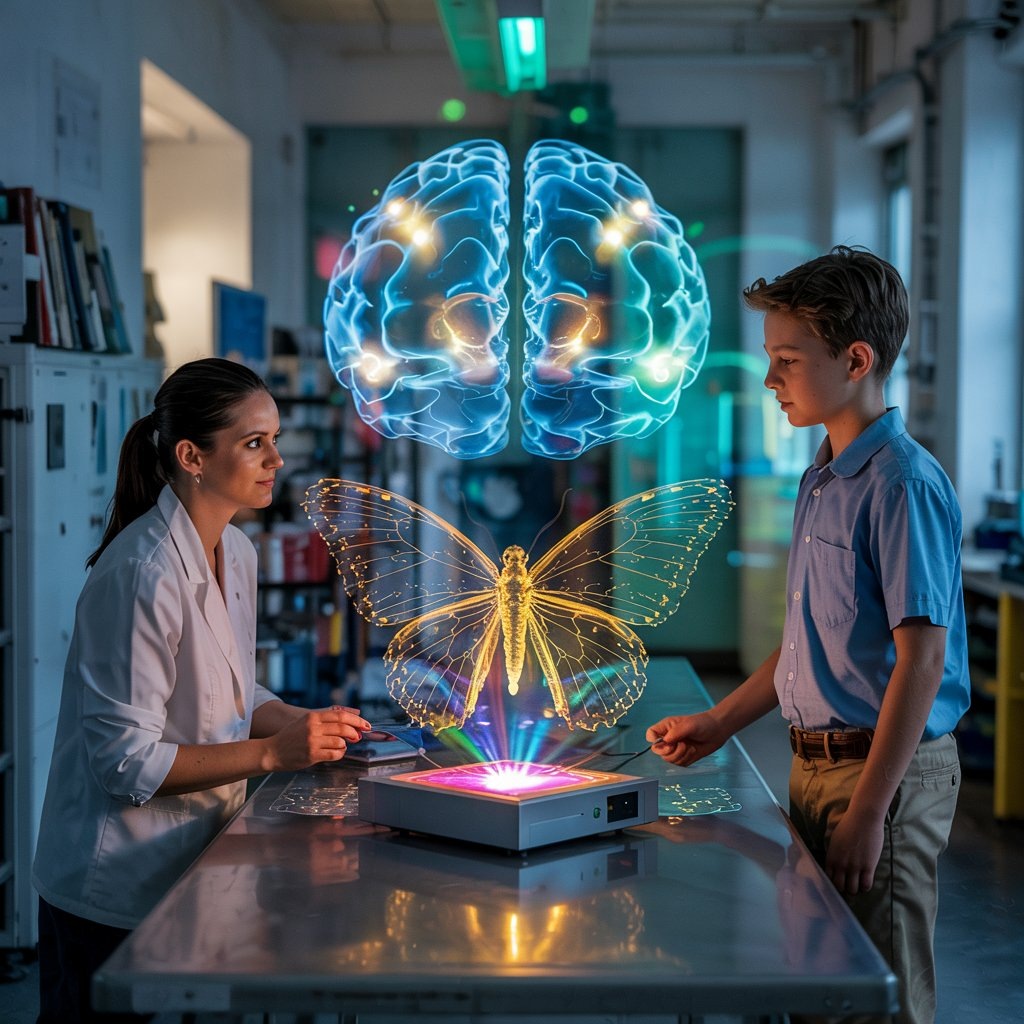 В центре лаборатории, на металлическом столе, мерцал голографический проектор. Над ним висела трехмерная модель человеческого мозга, расцвеченная зонами активности. Лира подошла ближе, и мозг вдруг рассыпался золотистыми пикселями, которые собрались в форму бабочки - той самой, о которой говорил Тимур.
