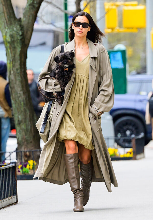 Пока одни задаются вопросом, умеет ли мальтипу Ирины Шейк по кличке Арахис ходить, другие интересуются, как на рядовой прогулке выглядеть так, словно ты только что сошла с подиума. С последним постараемся разобраться! Супермодель, уже долгое время живущую на Манхэттене, заметили на улицах Нью-Йорка. Кажется, что она выгуливала не собачку, а последние тренды — расслабленный оверсайз тренч с драпировкой на рукавах от Chloe сложного землисто-оливкового оттенка, сапоги длиной до колена (судя по тому, сколько раз девушка появлялась в них на публике, любимые), объемная, мешковатая сумка. Первым слоем — льняное платье с V-образным вырезом, завышенной талией и юбкой-баллоном. Вместе все смотрится стильно — монохром с разницей фактур решает! До льна нам еще месяца два, а вот тренч с каждым днем становится все актуальнее. Носить его можно и в +5 °C — просто надевайте под него тонкий пуховичок а-ля Uniqlo. Похожий «по настроению» плащ есть на Wildberries. Примерьте на размер-два больше вашего — ч