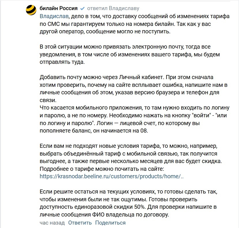 "Билайн» вместо извинений предложил скидку 50% - но при этом, тариф не изменился".