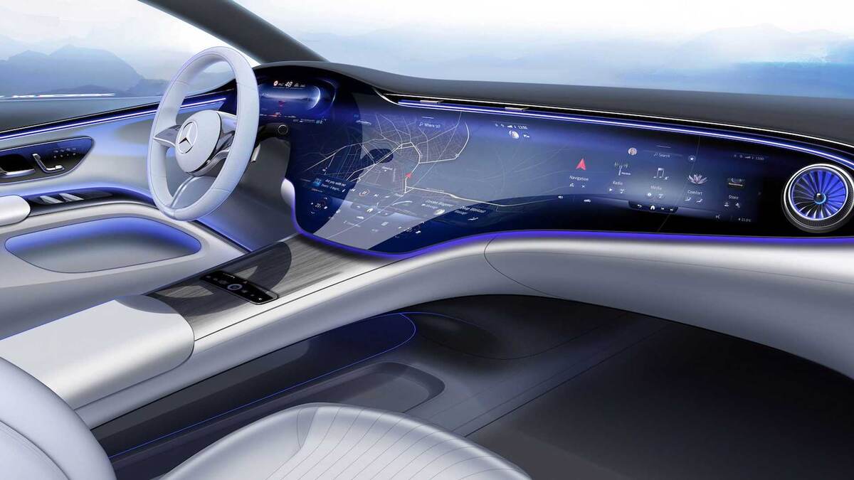 • Изогнутые экраны: В последнее время набирают популярность изогнутые экраны, которые не только выглядят футуристично, но и предоставляют водителям более удобный доступ к информации. Примером может служить модель Mercedes-Benz EQS, где используются большие изогнутые панели, объединяющие несколько экранов в одном.