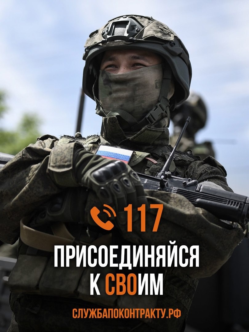 Вступай в ряды настоящих патриотов, присоединяйся к СВОим! ➡️ Чтобы поступить на военную службу по контракту, нужно обратиться в пункт отбора на военную службу (https://clck.ru/3CW3MK)или военкомат (https://clck.ru/3CW3Pp) по месту жительства. Подать заявку можно через единый портал государственных услуг (https://contract.gosuslugi.ru/) или сайт Минобороны России (https://clck.ru/3CW6TK). ❕ Подробности на сайте http://www.krskstate.ru/voen_kontrakts и по телефону 117, военкомат 8(39145)6-31-72 и пункт отбора 8-950-405-38-86.