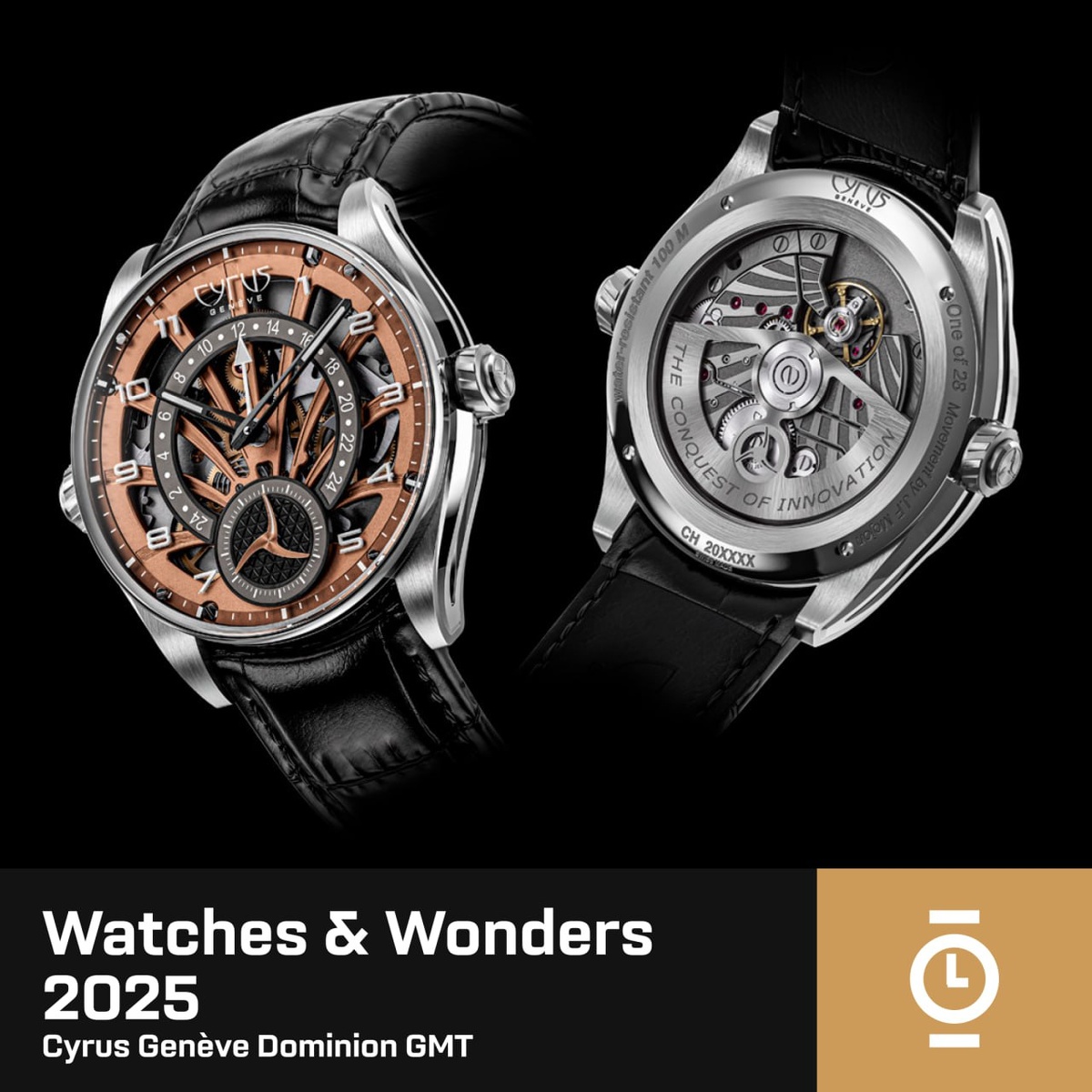 Cyrus Genève Dominion GMT #WW_WD Новые Cyrus Genève DOMINION GMT, разработанные Жаном-Франсуа Можоном, имеют характерный 42-мм корпус и функцию ретроградного двойного времени. У часов сложный, многослойный объёмный циферблат. Он скелетонизирован так, что напоминает пальму, и демонстрирует движение колёс механизма. Местное время отображается в привычном формате, а второй пояс — с помощью ретроградного 24-часового индикатора. Малая секунда оформлена в виде трёхлучевого «сюрикена» с изогнутыми лезвиями. Характерная форма корпуса с двумя заводными головками напоминает «Ристмонов» Константина Чайкина. ЗГ «на 3» позволяет заводить часы и настраивать местное время вместе со стрелкой второго пояса. Та, что «на 9», — на самом деле не ЗГ, а кнопка. При каждом нажатии на нее стрелка второго времени перемещается на час вперёд, а часы и минуты на основном циферблате не меняются. Модель довольно массивная — 16,13 мм в толщину при диаметре 42 мм. Зато водозащита — целых 100 м. В Dominion GMT исп