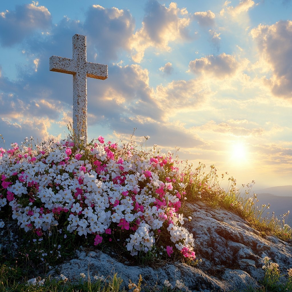 Создано на основе запроса: catholic cross on a hill with flowers, bright, white