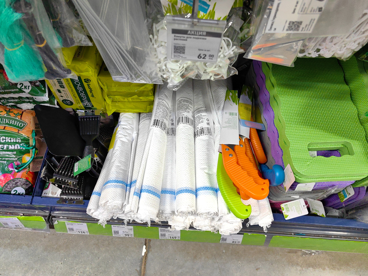 Скажу так, что новинок, тех, которые можно сразу взять для дела не одна. Например, вот они, в рулоны скатаны, только распаковали из коробки, на самой нижней полке лежат. Похожи на мешки из-под сахара или муки. Только новинка в отделе рядом с товарами для сада и дачи, никак не среди органайзеров для дома. Скорее всего потому, что на даче или в частном доме такие мешки чаще всего и нужны. Для уборки урожая, как вариант. Кому-то под удобрение. Что-то объемное привезти - да, тоже пригодятся. По высоте 95 см, ширина 55 см. Не заметила, чтобы переплетение было слабым, вполне плотно. Выдержит груз до 40 кг. Обратила внимание, в рулоне пять одинаковых мешков. Это за 149р. Идем дальше, вот эту новинку и назвала долгожданной, по сути, в коробочке спички для пикника. Но мне нужны для другой цели, на дачу нужны удлиненные спички для включения газового котла. По-другому никак. Обычно такие дороже выходят. А так коробочки в тридцать штук надолго хватит, и на базу отдыха, если соберемся в этом г