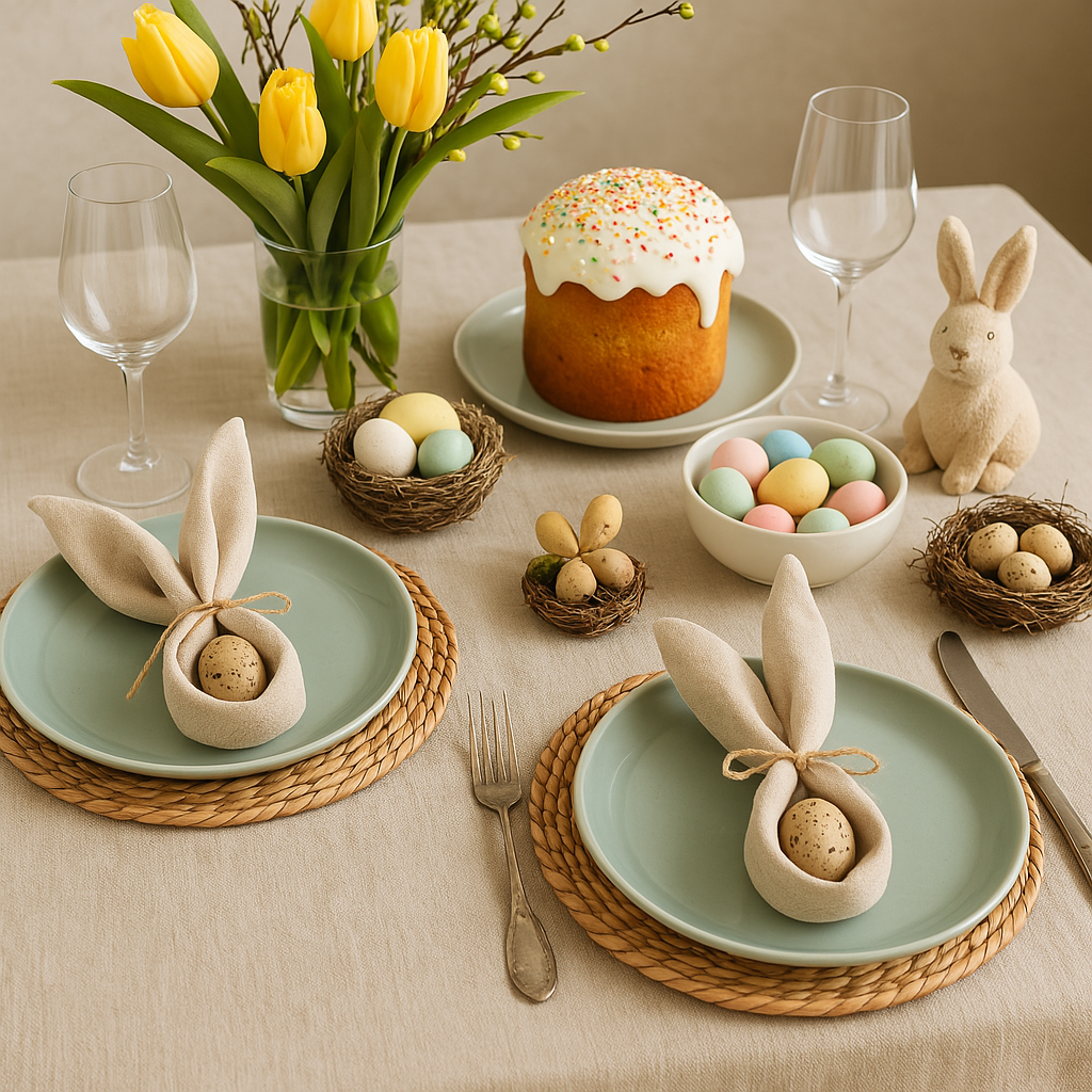 Пасхальный стол — это не только вкусная еда, но и особая атмосфера. Чтобы создать её, начинайте с выбора палитры: мягкие пастельные оттенки — зелёный, жёлтый, бежевый, голубой, пыльно-розовый — создадут ощущение весны и уюта. Скатерть лучше выбрать из натуральной ткани — льна или хлопка, желательно в спокойном светлом тоне, чтобы она стала фоном для ярких деталей. Добавьте живые весенние цветы — тюльпаны, нарциссы или веточки вербы. Они придадут свежести и оживят сервировку. Отличный акцент — мини-композиции с мхом, скорлупой, яицами или декоративными гнёздами. В центр стола можно поставить венок из веточек, зелени и яиц, украшенный лентами или свечами. Салфетки можно свернуть в виде зайчиков или просто перевязать шпагатом с веточкой розмарина. Для посуды подойдут простые формы в натуральных или пастельных тонах — они не перегрузят композицию, а подчеркнут домашний стиль. Для завершения образа добавьте небольшие детали: фигурки кроликов и цыплят, расписные яйца, свечи, ленты. Всё эт