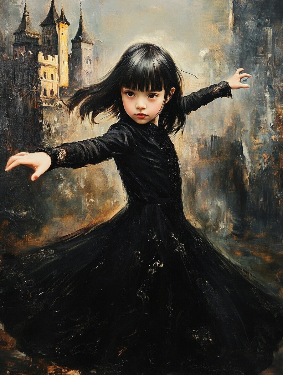 Создано на основе запроса: a Chinese child girl dancing hard with short black hair and bangs, Round face of a child, wearing black long dress, Vampire castle in the background, action painting, --- Автоперевод: Китайская детская девочка, сильно танцующая с короткими черными волосами и челкой, круглая лицо ребенка, в черном длинном платье, замок вампира на заднем плане, живопись, живопись, Неплохо выглядит? 🤔 https://dzen.ru/id/65c0c65c86e4f837c27b24d7 #ИИ #AI #нейросеть #midjourney #art