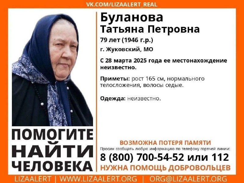 ❗️Пропал человек! Буланова Татьяна Петровна, 79 лет, Жуковский, МО. С 28 марта 2025 года ее местонахождение неизвестно. Инфорги: 📞 Синичка (Ирина), 89211953653, 📞 Яга84 (Марина) 89295593649. 📞 Гор. линия ПСО "ЛизаАлерт": 8(800)700-54-52.