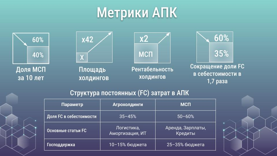 Современный агрорынок напоминает некооперативную игру, где агрохолдинги доминируют за счет масштаба (в среднем 43-кратное превосходство в площадях). Однако их преимущество нивелируется из-за плато рентабельности: снижение постоянных затрат всего в 1,7 раза делает их уязвимыми. Точки роста для МСП и Агрохолдингов Согласно теории Нэша, в некооперативных играх участники не могут улучшить результат, действуя в одиночку. Это подтверждается практикой: агрохолдинги, опирающиеся на экстенсивный рост, теряют гибкость, а их зависимость от экспорта и логистики (до 30% себестоимости) усиливает риски. Кооперация как равновесие Нэша