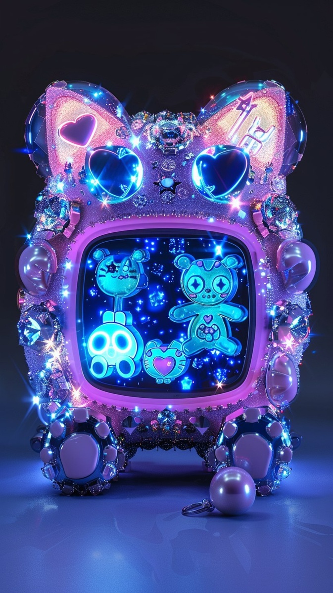 Создано на основе запроса: Cute digital pet toy inspired by Tamagotchi, cat-ear shape, decorated with shiny crystals and gems (hearts, stars, diamonds), glowing buttons, futuristic design, perfectly front-facing, looking directly at the viewer, no rotation or tilt, flat-on view, large digital screen showing blue cartoon skull characters and milk-themed graphics, pearl keychain, 3D render, ultra-detailed, dreamy lighting, vibrant colors, symmetrical and centered composition