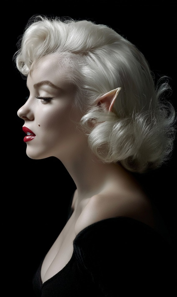 Создано на основе запроса: Marilyn Monroe profile long white hair, white eyes, elf ears, HD