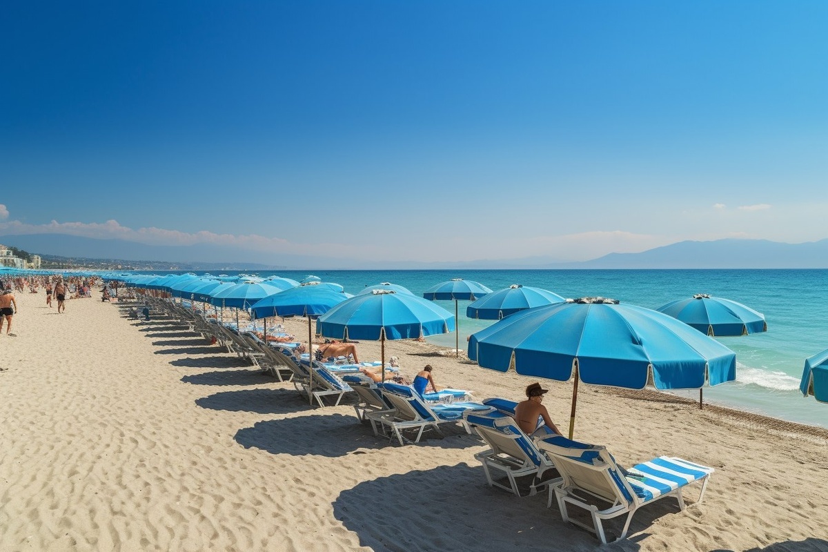 Создано на основе запроса: A realistic daytime beach scene from Paralia, Greece. Rows of blue sunbeds and umbrellas face a gently lapping sea. The beach is sandy and active, with locals and tourists walking, playing, and sitting. Behind the beach, souvenir stands and grill restaurants are visible. Light is clear and summery, nothing stylized. --- Автоперевод: Реалистичная дневная пляжная сцена из Паралии, Греция. Как тебе эта иллюстрация? 🤔 https://dzen.ru/id/65c0c65c86e4f837c27b24d7 #ИИ #AI #нейросеть #midjourney #art
