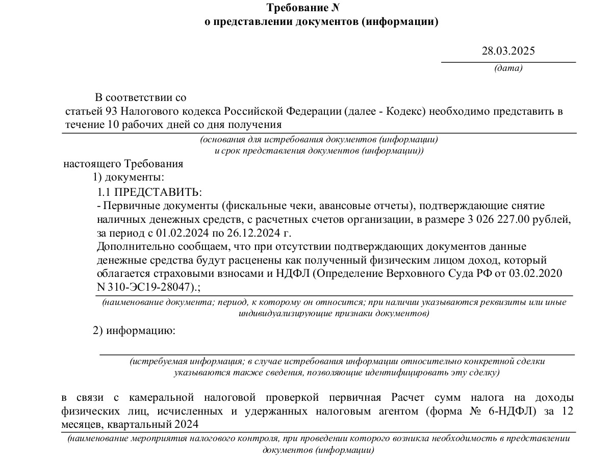 Делимся своим Алгоритмом: 1. Разбираемся в задаче Чтобы что-то сделать хорошо, надо понимать, какой результат нужно получить. Результат — это не сам текст ответа на требование, а то, как он повлияет на ситуацию (ход проверки). Поэтому самая первая задача — это понять, что хочет клиент, и с какой целью он пришел. В отношении требования на фото наш клиент озвучил свой запрос так: Написать ответ, чтобы налоговая отстала и не было последствий 2. Знакомимся с бизнесом Не обязательно знать все подробности, но общее представление о бизнесе получить надо. Кроме того, важно понять, какие есть ограничения по ситуации - что писать нельзя. В нашем примере мы получили от бухгалтера следующую информацию о деятельности: Грузоперевозки, самосвалы в лизинге, торговля нерудными материалами. Есть своя база, где сами чиним машины. Чеки есть, но не факт, что наберу конкретно на эту сумму. По факту, конечно же, снимали на зарплату, и плюс покупали нерудные материалы за наличку- сами понимает