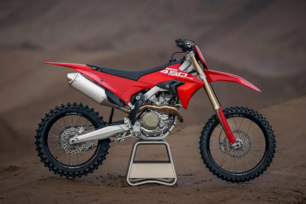 Такая тяга, что неудивительно, достигается за счет одноцилиндрового двигателя объемом 450 куб. см — стандартного для данного сегмента — но новинкой для мотокросса является внедрение фирменной десмодромной компоновки клапанов Ducati, которая также применяется в мотоциклах MotoGP и Superbike.