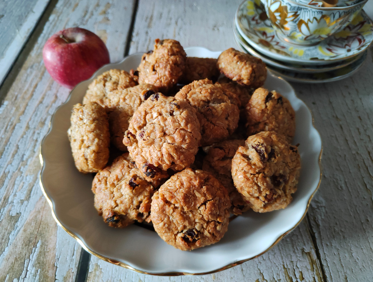 Печенье без молочных продуктов и яиц в составе. На вкус напоминает батончики-мюсли и чем дольше лежит, тем становится вкуснее: - овсяные хлопья 200 г - мука в/с 100 г - масло подсолнечное 100 г - изюм б/к 100 г - сахар 50 г - мёд 50 г - разрыхлитель 1 ч.ложка - соль на кончике ножа Если у вас, как и у меня, обычный Геркулес длительной варки, его нужно предварительно измельчить до состояния крупной крошки: Изюм также необходимо подготовить. Хорошо промываем его, убираем веточки, если они есть, и обсушиваем: Смешиваем в миске все сухие ингредиенты: овсянку, муку, соль, сахар, разрыхлитель: Затем добавляем мёд и масло: Всё хорошо перемешиваем. Получается довольно рассыпчатая маслянистая масса. Спрессовываем её в один плотный ком. Накрываем и оставляем на столе на 30 минут⏳ 🔥Духовку нагреваем до 180 градусов. Отщипываем от теста небольшие порции и скатываем шарики размером с крупный грецкий орех. Придавливаем, чтобы толщина была примерно 1,5 см, выкладываем на противень: Отправл