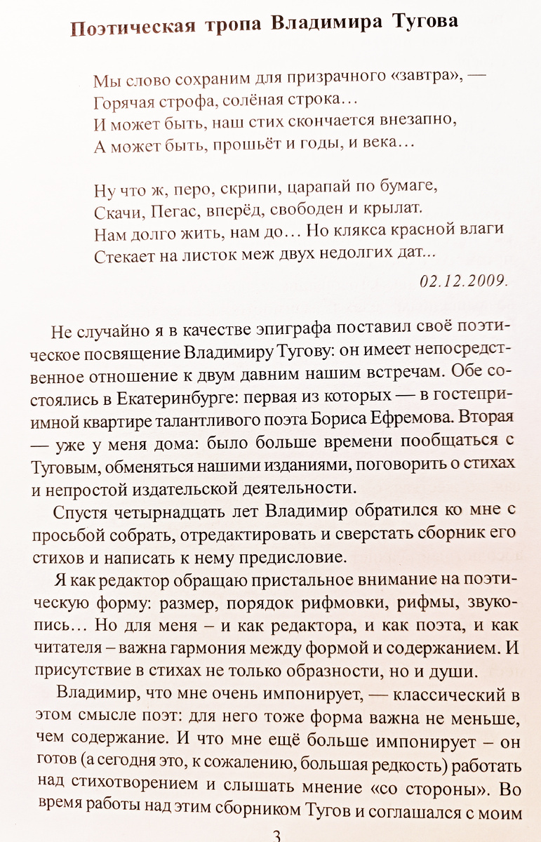Владимир , что мне очень импонирует, - классический в этом смысле поэт: для него тоже форма важна не меньше, чем содержание. И что мне ещё больше импонирует - он готов (а сегодня это, к сожалению, большая редкость) работать над стихотворением и слышать мнение "со стороны". Во время работы над этим сборником Тугов и соглашался с моим редакторским мнением (говорил: "Убедил!"), и спорил, отстаивая некоторые стихи, которые я первоначально отвергал. С какими-то его доказательствами я соглашался, какие-то решительно отвергал: шёл нормальный процесс работы над сборником.
