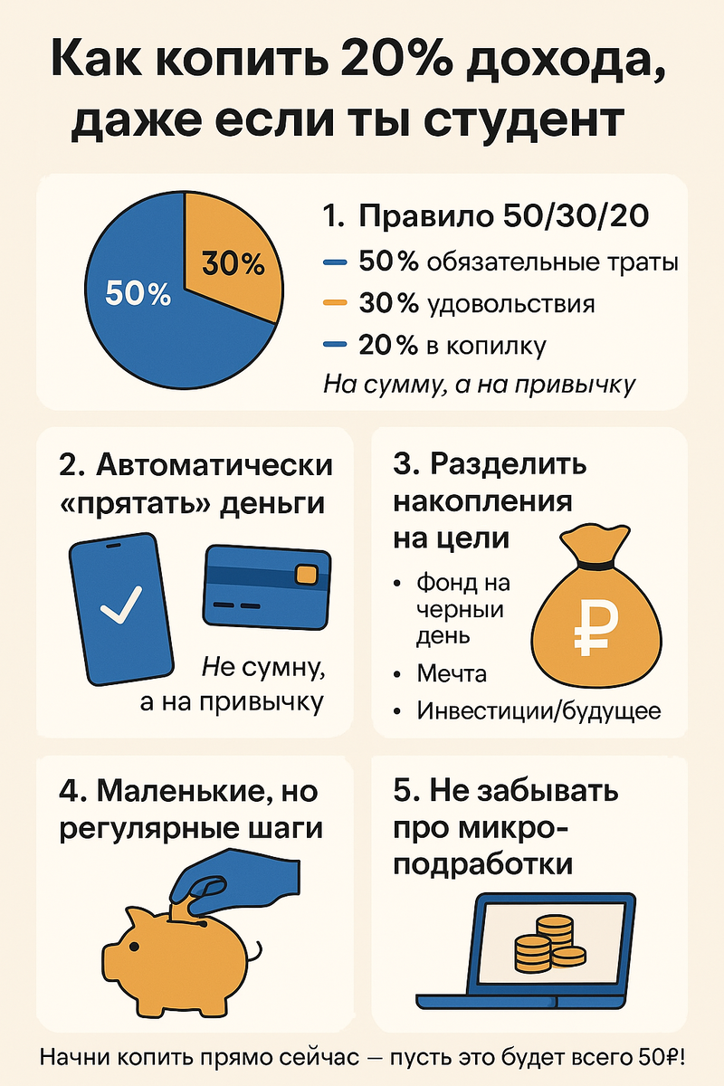Вывод: Быть студентом — не значит быть без денег. Это время, когда ты формируешь финансовое поведение. Начни копить прямо сейчас — даже если это всего 50₽. Потому что завтра ты будешь благодарен себе за эту привычку
